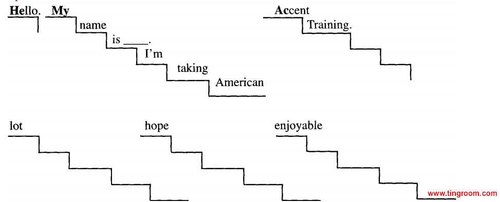 Draw one step of the staircase for each word of the paragraph. Start a new staircase for every stressed word. There usually is more than one staircase in a se ntence. New sentences don't have to start new staircases; they can cont inue from the previous sentence until you come to a stressed word. I'll read the beginning sentences. Chec k the first sentence against the example. Then put the words o f the second sentence on a staircase, based on the way I read it. Remember, I'm exaggerating to make a point.